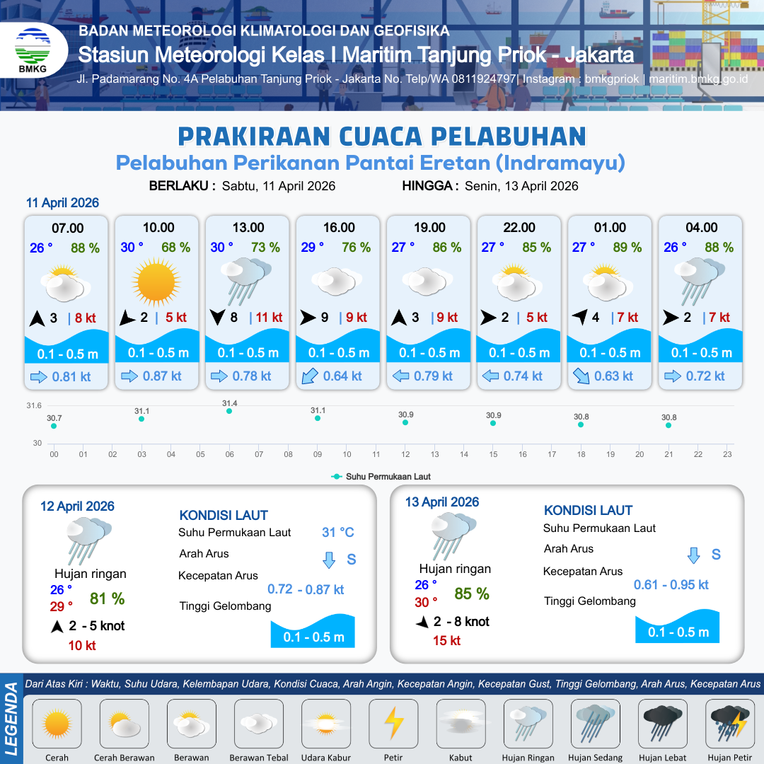 11 Apr 26, 21.00 3 jam kedepan | Hujan Ringan | Barat 2 kt Gust Peningkatan kecepatan angin yang singkat dan tiba-tiba : 7 kt | | | 9 km | 26 °C | 88 % | +0.59 m |