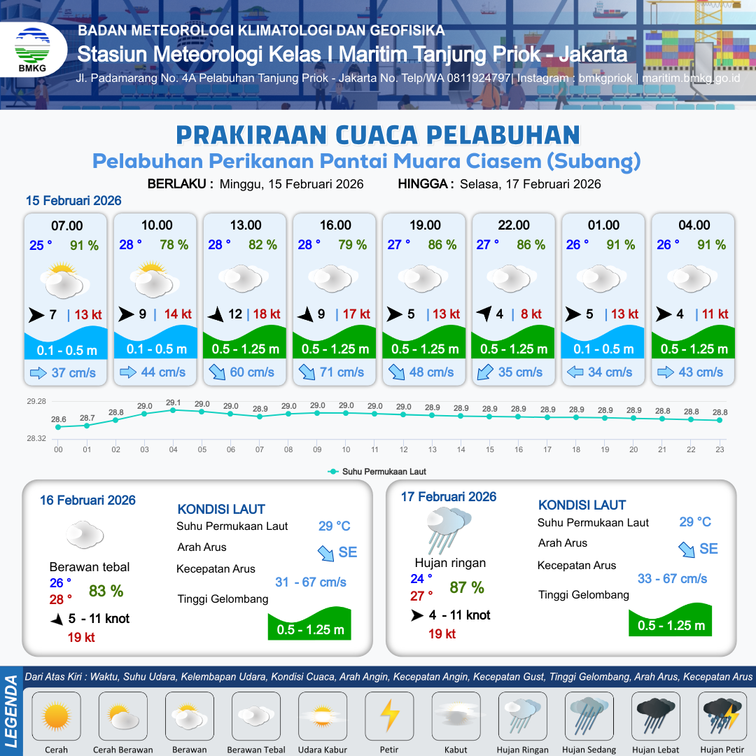 15 Feb 26, 05.00 14 jam yang lalu | Berawan Tebal | Barat Laut 12 kt Gust Peningkatan kecepatan angin yang singkat dan tiba-tiba : 16 kt | | | 9 km | 29 °C | 73 % | +0.10 m |