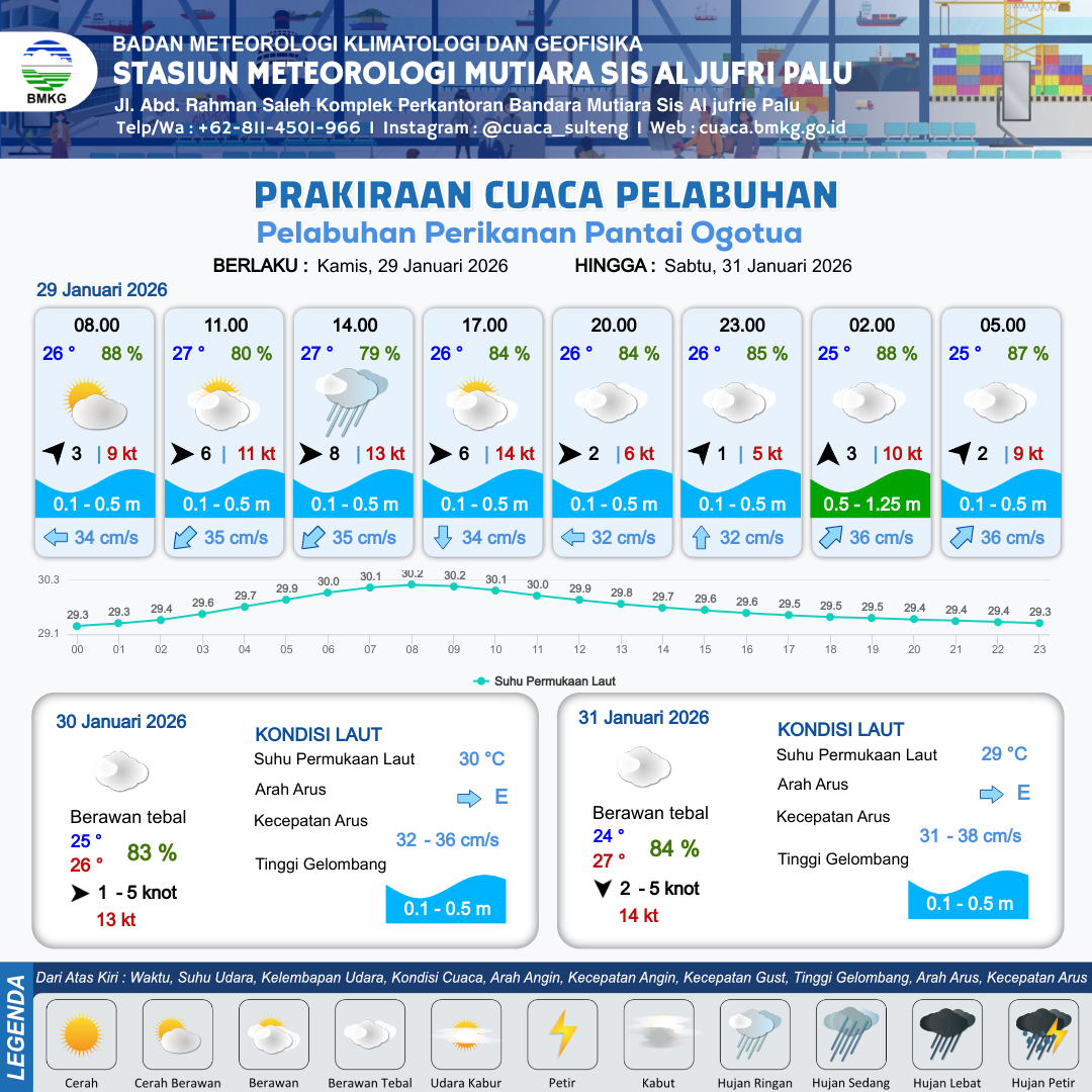 29 Jan 26, 07.00 11 jam yang lalu | Berawan Tebal | Barat 8 kt Gust Peningkatan kecepatan angin yang singkat dan tiba-tiba : 15 kt | | | 9 km | 26 °C | 81 % | +0.63 m |