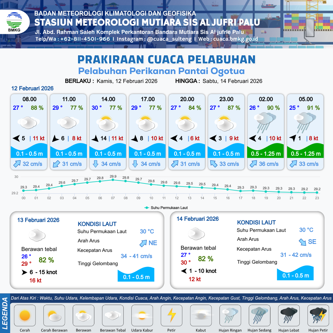 12 Feb 26, 06.00 13 jam yang lalu | Berawan | Barat Laut 14 kt Gust Peningkatan kecepatan angin yang singkat dan tiba-tiba : 11 kt | | | 10 km | 30 °C | 77 % | +0.30 m |