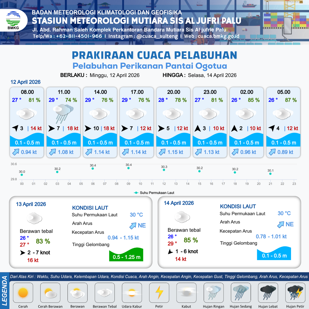 12 Apr 26, 09.00 2 jam kedepan | Barat 7 kt Gust Peningkatan kecepatan angin yang singkat dan tiba-tiba : 12 kt | 0.3 m Tenang | Timur Laut 1.1 Knot | 9 km | 29 °C | 76 % | +0.66 m | |
