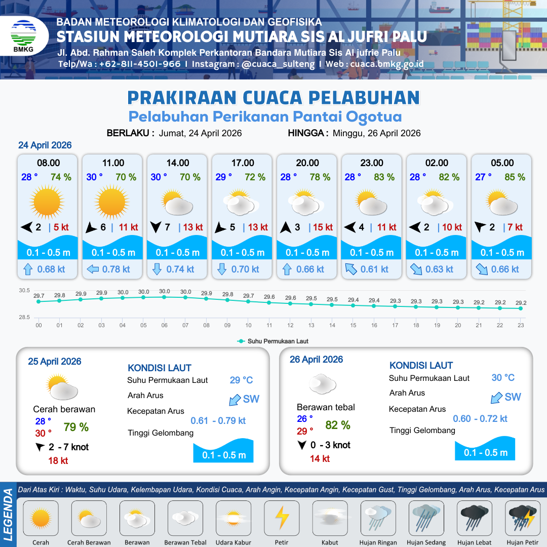 23 Apr 26, 19.00 8 jam kedepan | Tenggara 2 kt Gust Peningkatan kecepatan angin yang singkat dan tiba-tiba : 9 kt | 0.1 m Tenang | Tenggara 0.6 Knot | 10 km | 27 °C | 85 % | -0.34 m | |