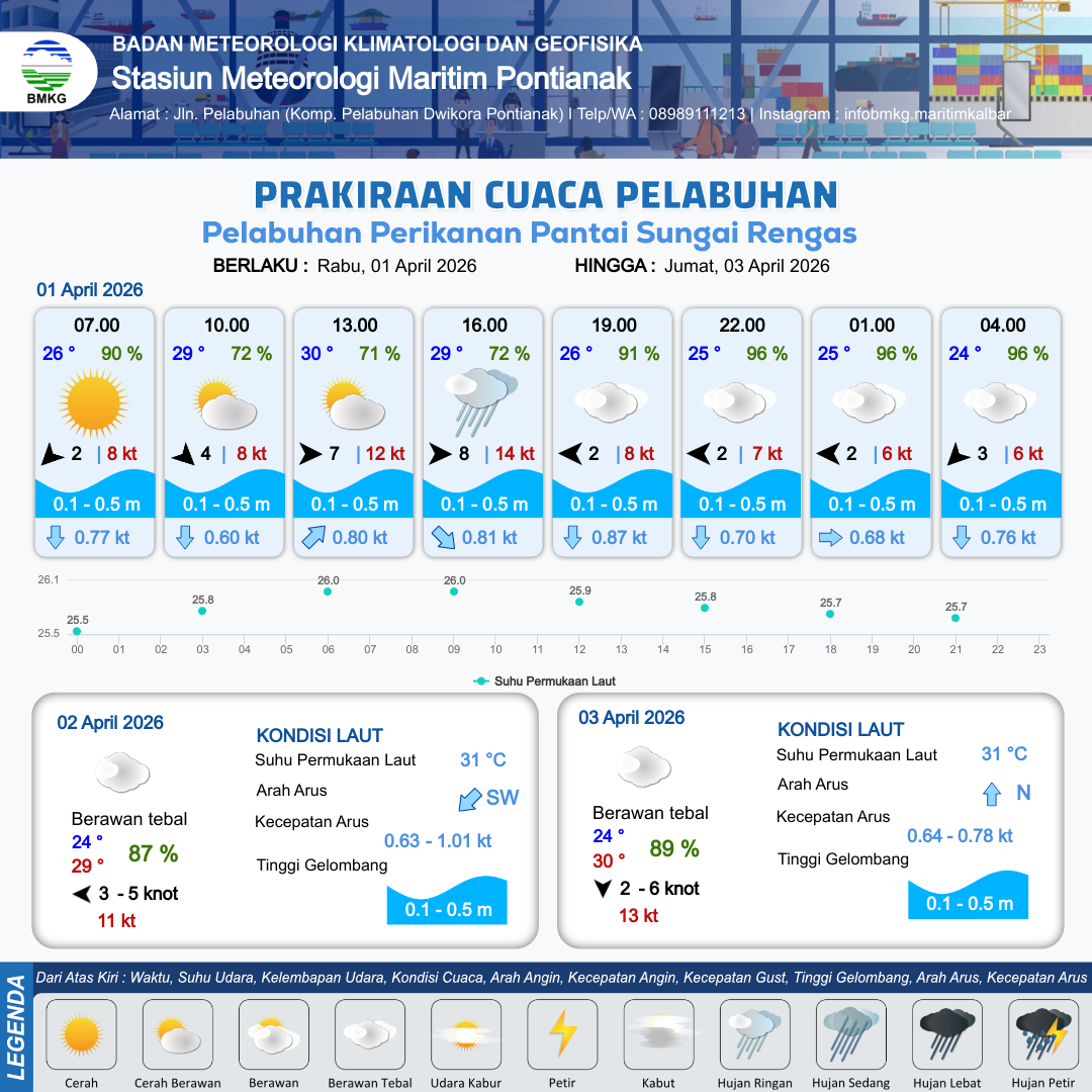1 Apr 26, 23.00 4 jam kedepan | Berawan Tebal | Timur 4 kt Gust Peningkatan kecepatan angin yang singkat dan tiba-tiba : 9 kt | | | 10 km | 24 °C | 97 % | +0.75 m |