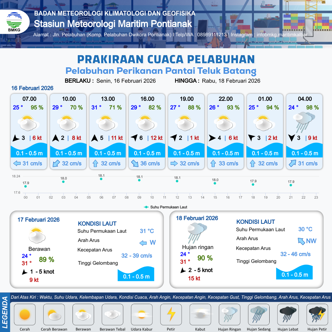 16 Feb 26, 15.00 4 jam yang lalu | Berawan | Barat 4 kt Gust Peningkatan kecepatan angin yang singkat dan tiba-tiba : 6 kt | | | 10 km | 26 °C | 93 % | -0.70 m |