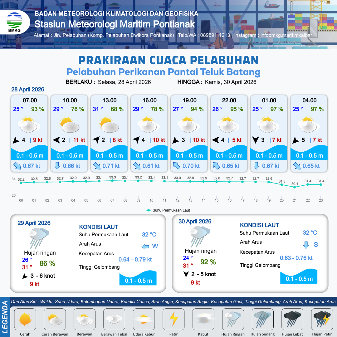 27 Apr 26, 09.00 8 jam kedepan | Barat Daya 5 kt Gust Peningkatan kecepatan angin yang singkat dan tiba-tiba : 10 kt | 0.1 m Tenang | Utara 0.7 Knot | 6 km | 29 °C | 77 % | -1.22 m | |