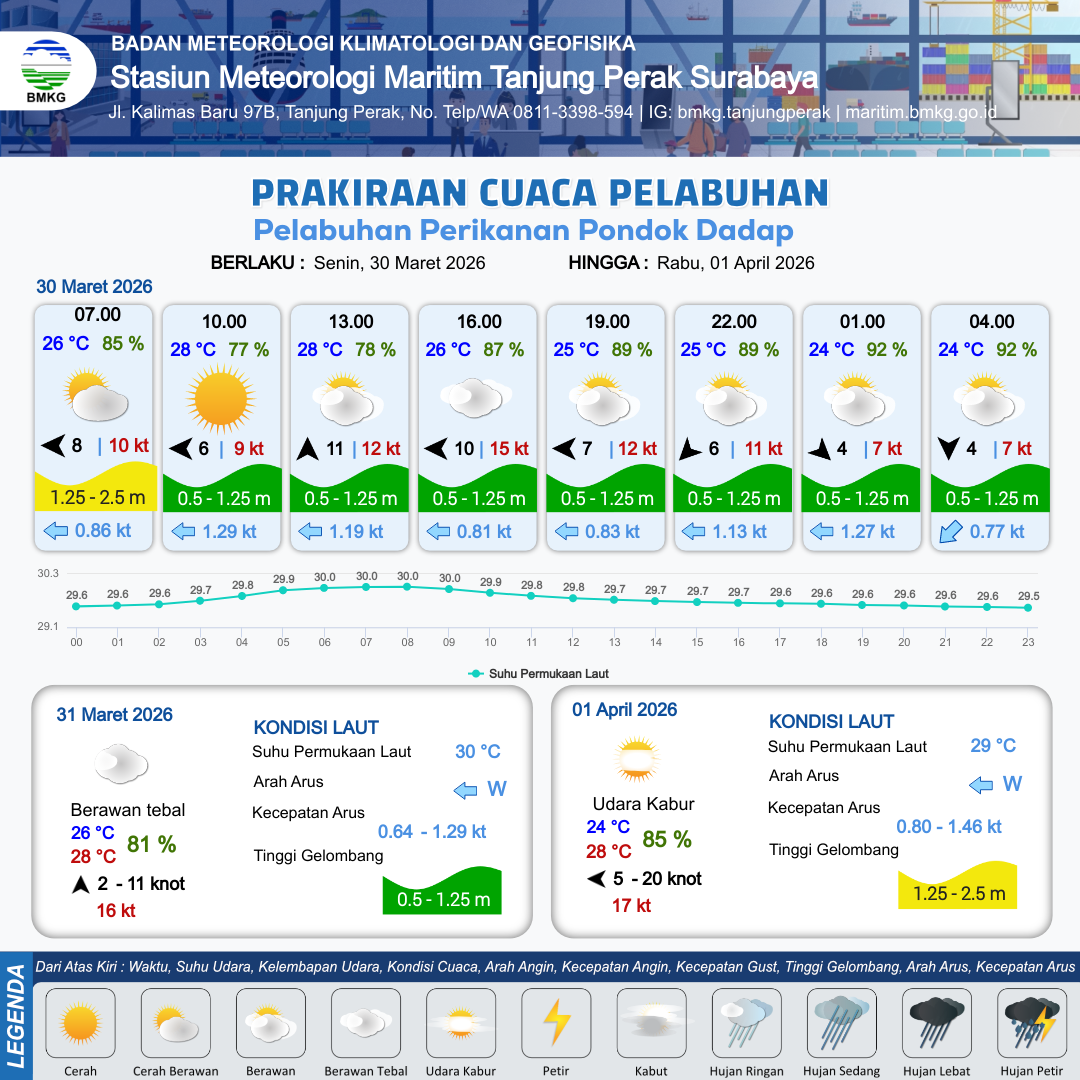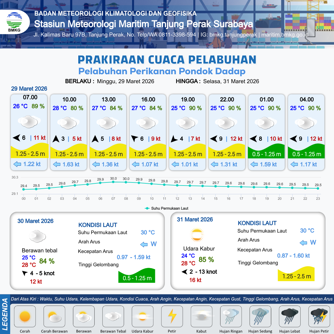 29 Mar 26, 23.00 15 jam kedepan | Timur Laut 5 kt Gust Peningkatan kecepatan angin yang singkat dan tiba-tiba : 10 kt | 1.2 m Rendah | Barat 1.0 Knot | 10 km | 25 °C | 90 % | +0.33 m |