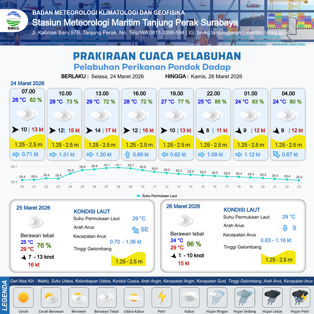 24 Mar 26, 11.00 4 jam kedepan | Barat 10 kt Gust Peningkatan kecepatan angin yang singkat dan tiba-tiba : 14 kt | 1.8 m Sedang | Barat 0.8 Knot | 10 km | 27 °C | 75 % | -0.95 m | |
