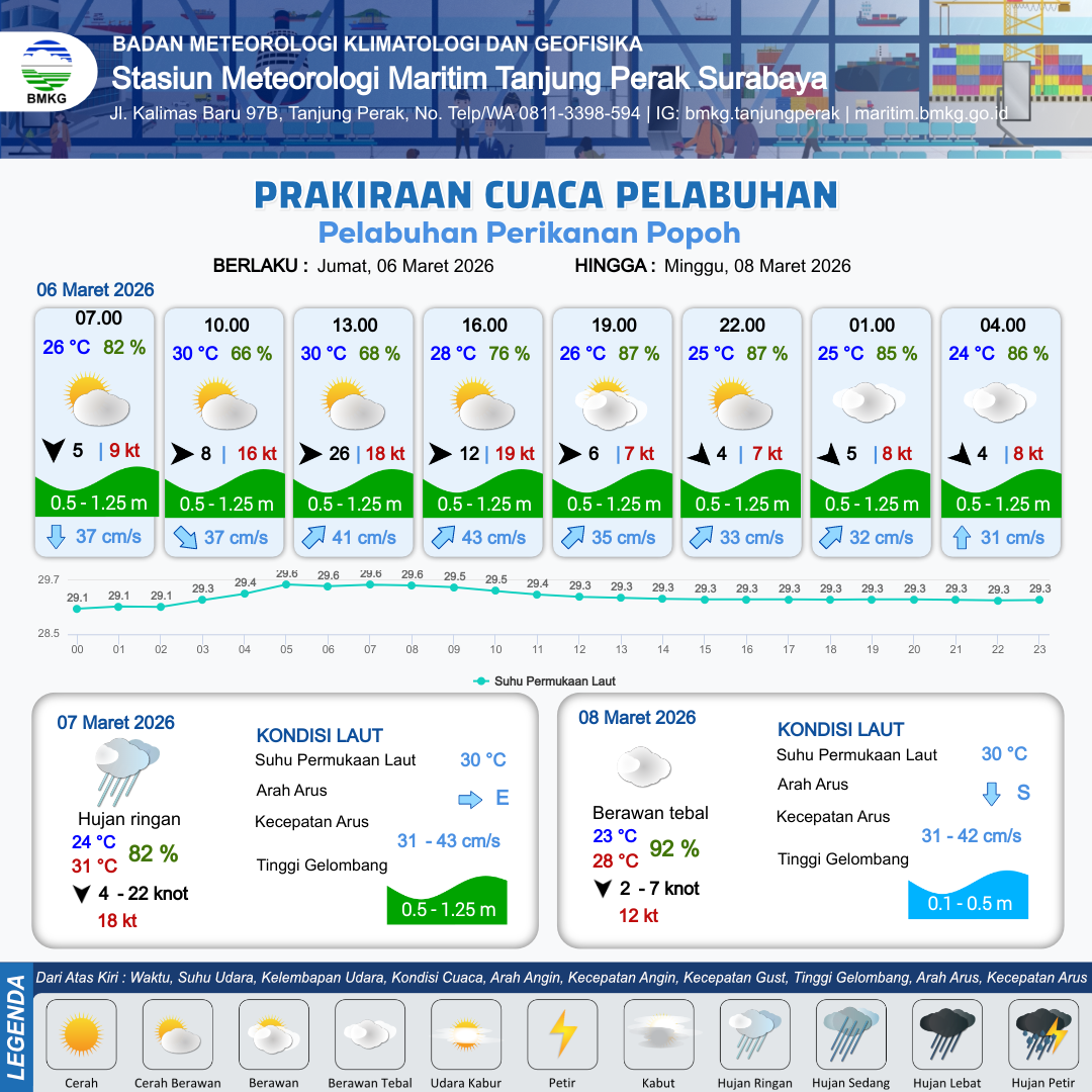 6 Mar 26, 12.00 8 jam kedepan | Barat 6 kt Gust Peningkatan kecepatan angin yang singkat dan tiba-tiba : 7 kt | 0.7 m Rendah | Timur Laut 35.0 cm/s | 10 km | 26 °C | 87 % | +0.02 m | |