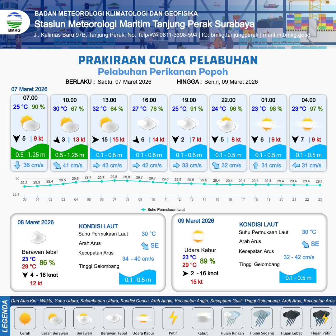 7 Mar 26, 05.00 5 jam kedepan | Barat 15 kt Gust Peningkatan kecepatan angin yang singkat dan tiba-tiba : 13 kt | 0.5 m Rendah | Timur 41.0 cm/s | 9 km | 32 °C | 62 % | +0.95 m | |