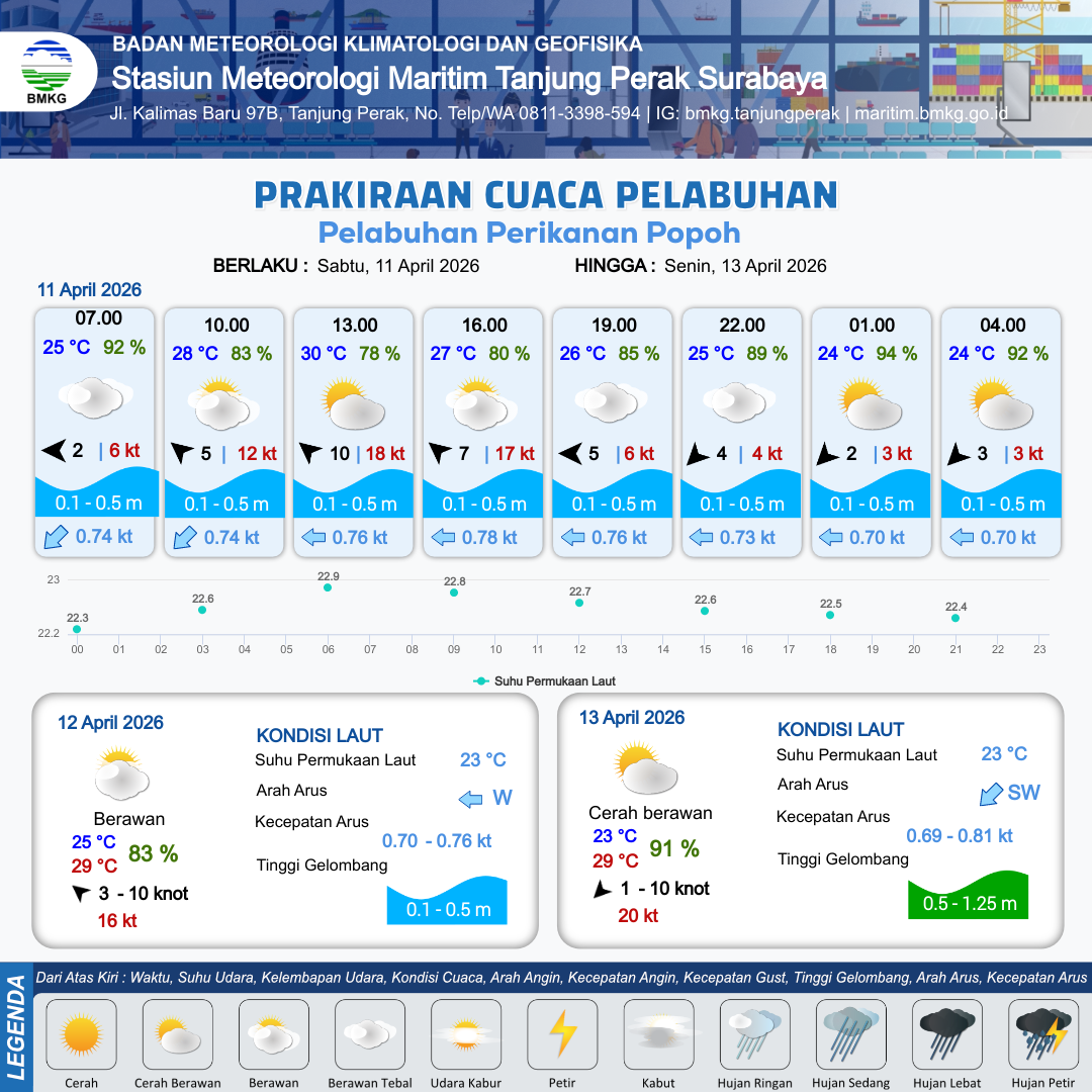 11 Apr 26, 16.00 Saat ini | Timur Laut 4 kt Gust Peningkatan kecepatan angin yang singkat dan tiba-tiba : 3 kt | 0.4 m Tenang | Barat 0.7 Knot | 10 km | 25 °C | 90 % | +0.34 m | |