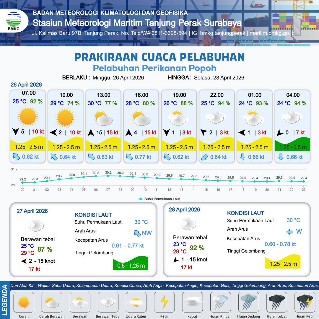 26 Apr 26, 23.00 24 jam kedepan | Timur 2 kt Gust Peningkatan kecepatan angin yang singkat dan tiba-tiba : 3 kt | 1.2 m Rendah | Selatan 0.6 Knot | 10 km | 25 °C | 92 % | +0.05 m |