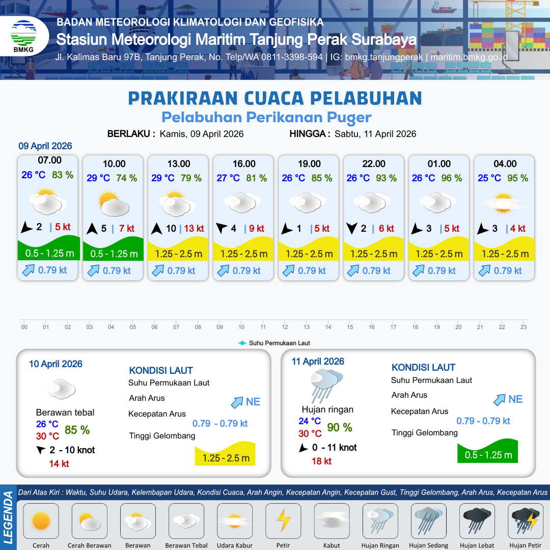 8 Apr 26, 21.00 4 jam kedepan | Berawan Tebal | Timur Laut 3 kt Gust Peningkatan kecepatan angin yang singkat dan tiba-tiba : 6 kt | | | 10 km | 24 °C | 95 % | +0.35 m |