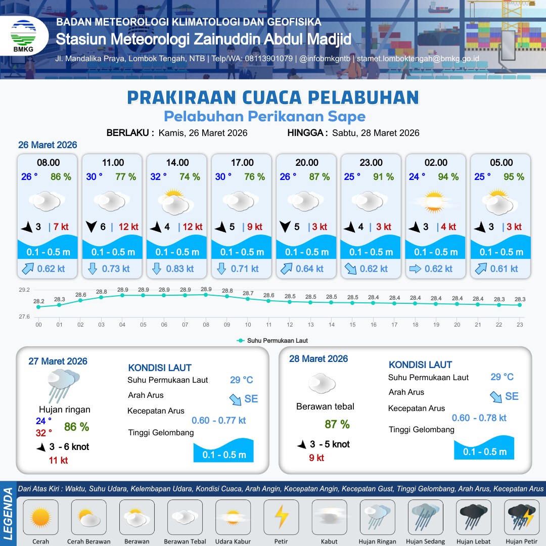 26 Mar 26, 13.00 3 jam kedepan | Utara 5 kt Gust Peningkatan kecepatan angin yang singkat dan tiba-tiba : 2 kt | 0.1 m Tenang | Tenggara 0.6 Knot | 10 km | °C | 88 % | -0.05 m | |
