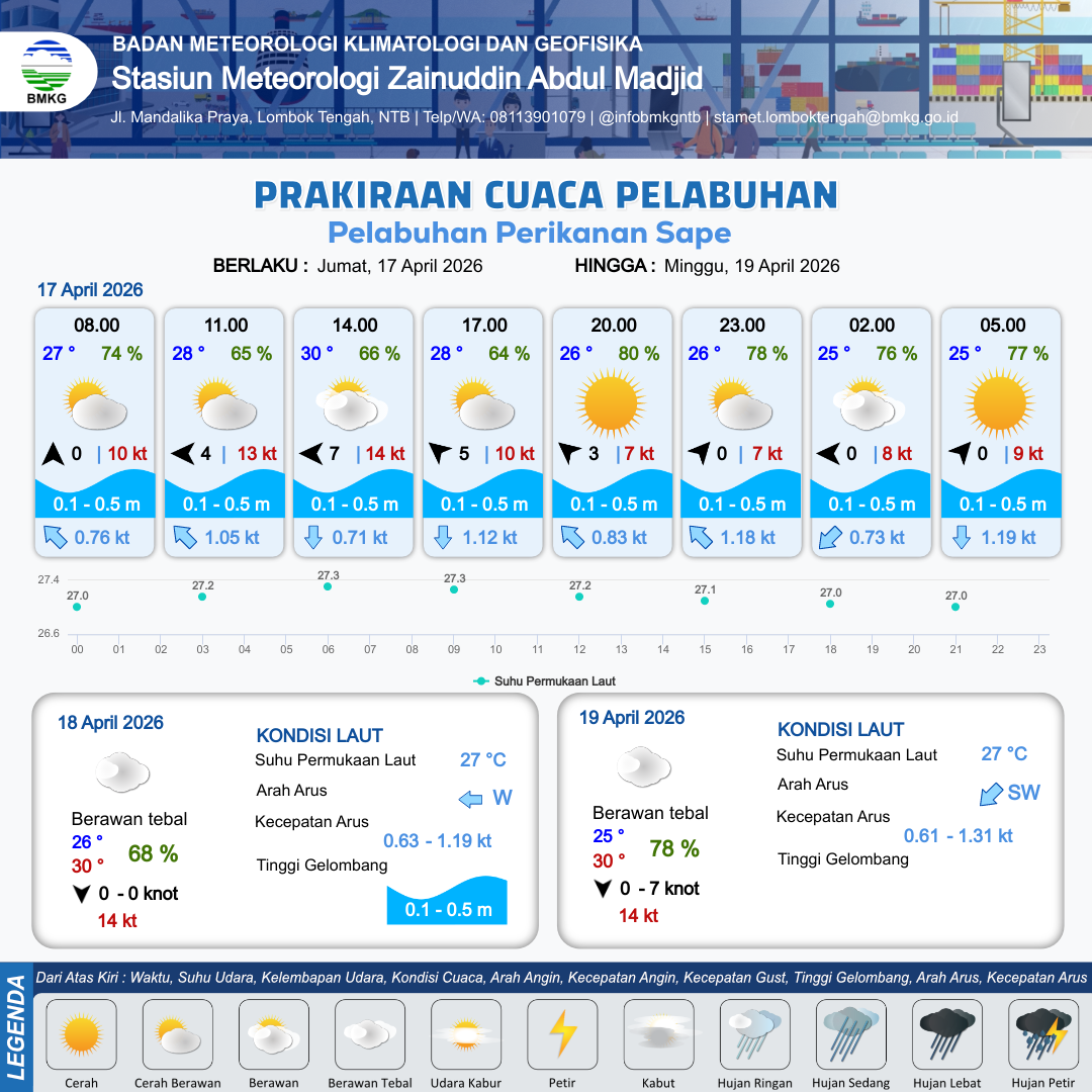 17 Apr 26, 23.00 14 jam kedepan | Barat Laut 0 kt Gust Peningkatan kecepatan angin yang singkat dan tiba-tiba : 7 kt | 0.1 m Tenang | Barat 0.7 Knot | 7 km | 26 °C | 73 % | - m |