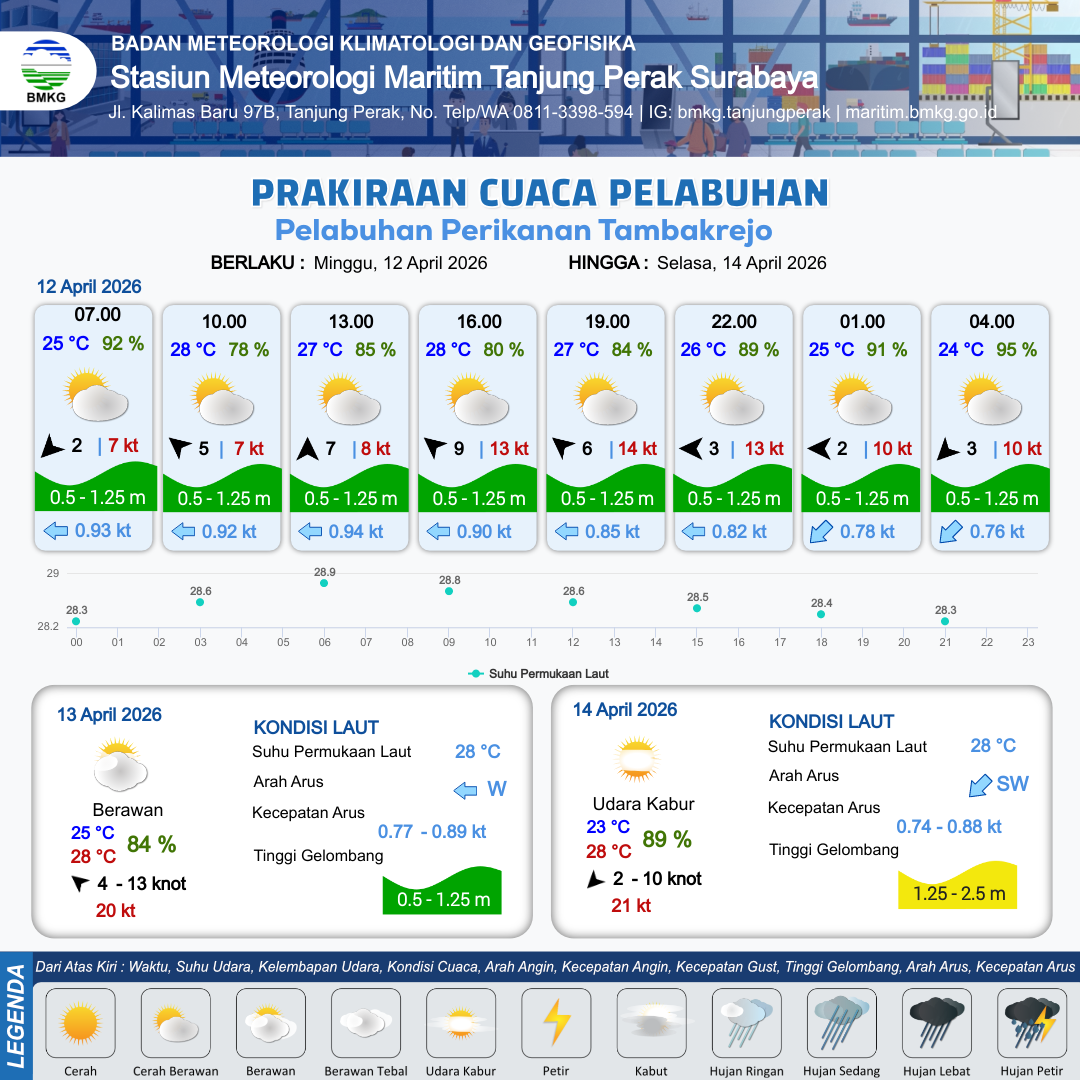 12 Apr 26, 23.00 11 jam kedepan | Timur 4 kt Gust Peningkatan kecepatan angin yang singkat dan tiba-tiba : 10 kt | 0.8 m Rendah | Barat 0.8 Knot | 10 km | 25 °C | 93 % | +0.45 m |