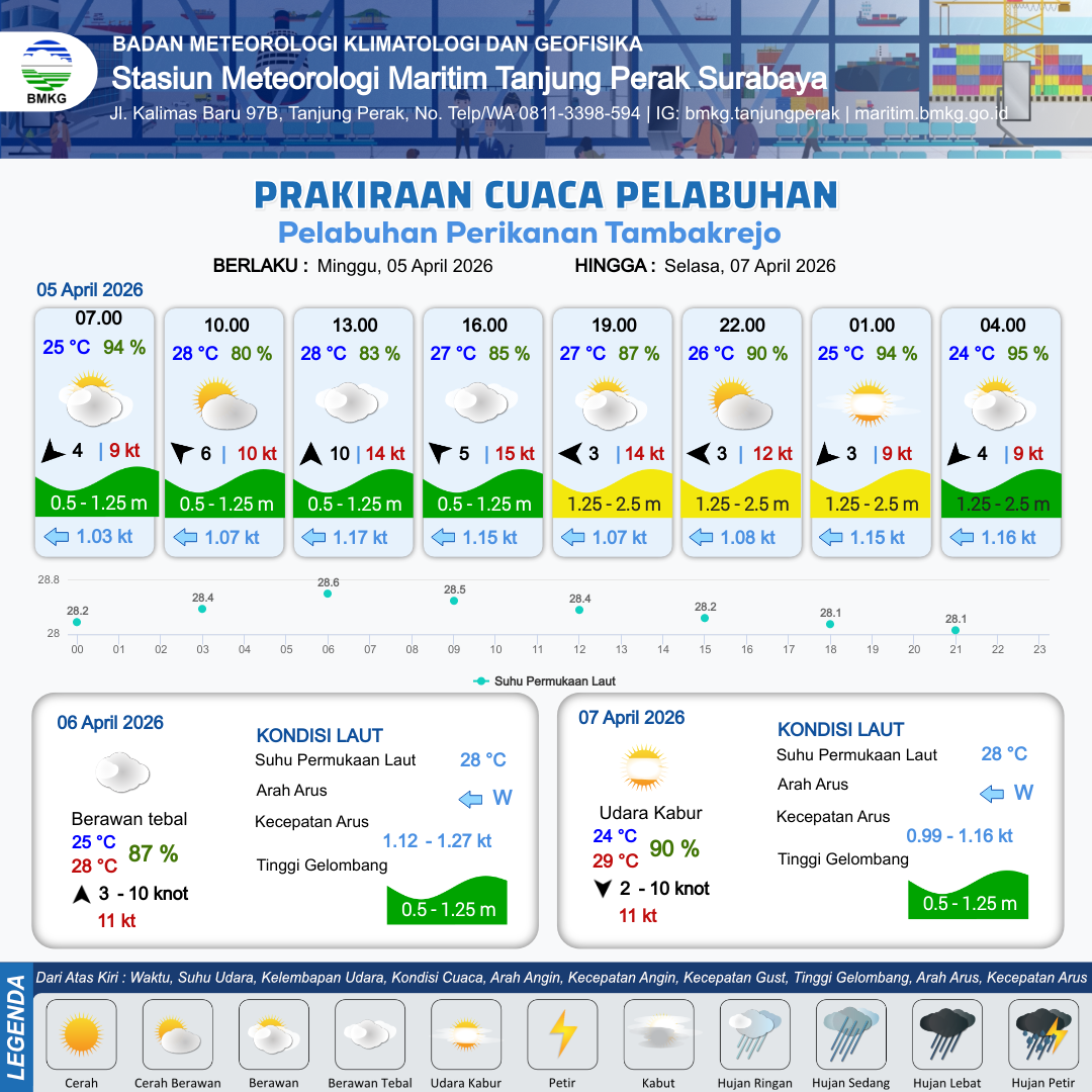 4 Apr 26, 21.00 3 jam kedepan | Kabut | Timur Laut 3 kt Gust Peningkatan kecepatan angin yang singkat dan tiba-tiba : 7 kt | | | 1 km | 24 °C | 96 % | +0.40 m |