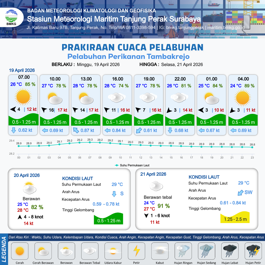 19 Apr 26, 08.00 2 jam kedepan | Tenggara 11 kt Gust Peningkatan kecepatan angin yang singkat dan tiba-tiba : 16 kt | 1.1 m Rendah | Barat 0.9 Knot | 10 km | 28 °C | 76 % | -1.20 m | |