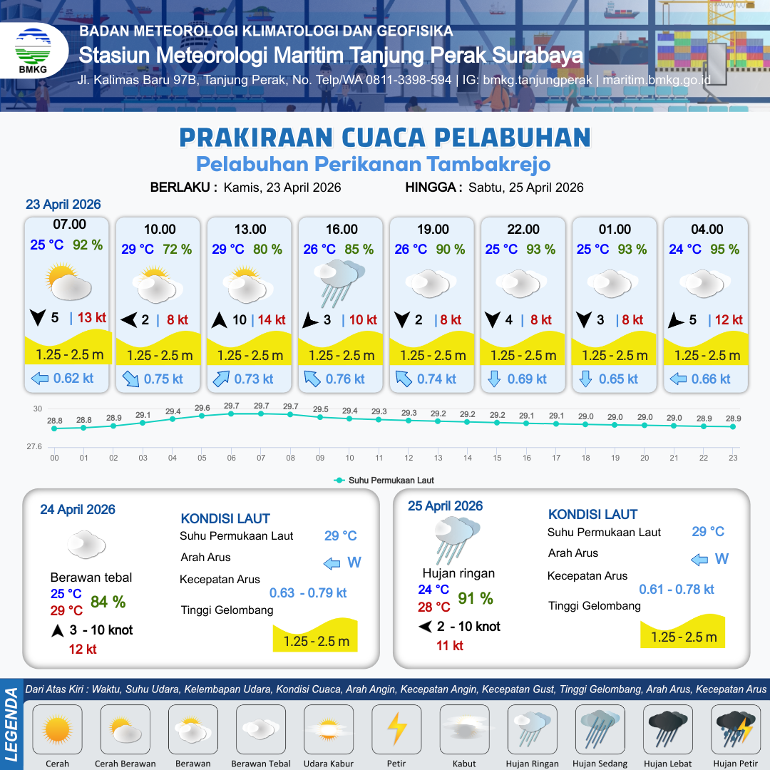 21 Apr 26, 23.00 4 jam kedepan | Cerah Berawan | Utara 9 kt Gust Peningkatan kecepatan angin yang singkat dan tiba-tiba : 16 kt | | | 10 km | 25 °C | 91 % | -0.73 m |