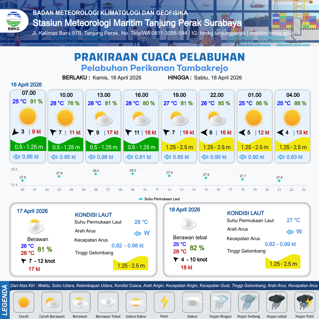 16 Apr 26, 23.00 10 jam kedepan | Timur 7 kt Gust Peningkatan kecepatan angin yang singkat dan tiba-tiba : 14 kt | 1.4 m Sedang | Barat 0.8 Knot | 10 km | 25 °C | 89 % | +0.46 m |