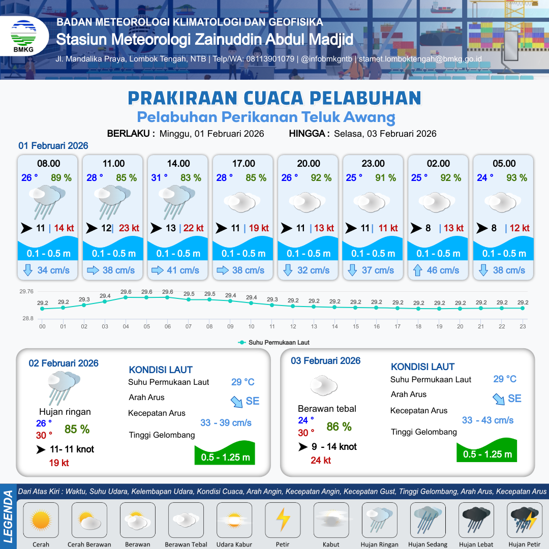 1 Feb 26, 22.00 2 jam kedepan | Berawan Tebal | Barat 8 kt Gust Peningkatan kecepatan angin yang singkat dan tiba-tiba : 12 kt | | | 8 km | 25 °C | 92 % | -0.81 m |