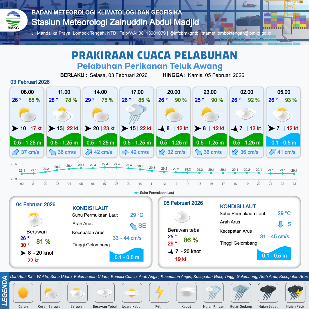 3 Feb 26, 06.00 12 jam yang lalu | Cerah Berawan | Barat 20 kt Gust Peningkatan kecepatan angin yang singkat dan tiba-tiba : 23 kt | | | 10 km | 29 °C | 75 % | +0.15 m |