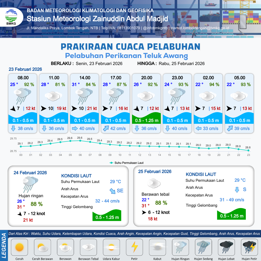 23 Feb 26, 23.00 8 jam kedepan | Barat Laut 7 kt Gust Peningkatan kecepatan angin yang singkat dan tiba-tiba : 14 kt | 0.6 m Rendah | Timur 31.0 cm/s | 5 km | 24 °C | 92 % | -0.78 m |