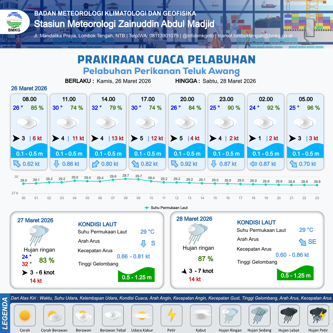 26 Mar 26, 10.00 3 jam kedepan | Barat 5 kt Gust Peningkatan kecepatan angin yang singkat dan tiba-tiba : 6 kt | 0.4 m Tenang | Selatan 0.8 Knot | 10 km | °C | 78 % | -0.14 m | |
