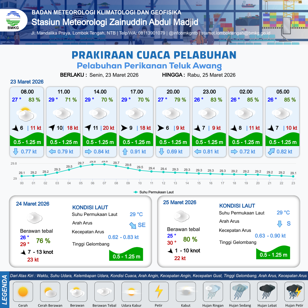 23 Mar 26, 08.00 3 jam kedepan | Barat 9 kt Gust Peningkatan kecepatan angin yang singkat dan tiba-tiba : 19 kt | 0.8 m Rendah | Timur 0.8 Knot | 10 km | 29 °C | 70 % | -0.28 m | |