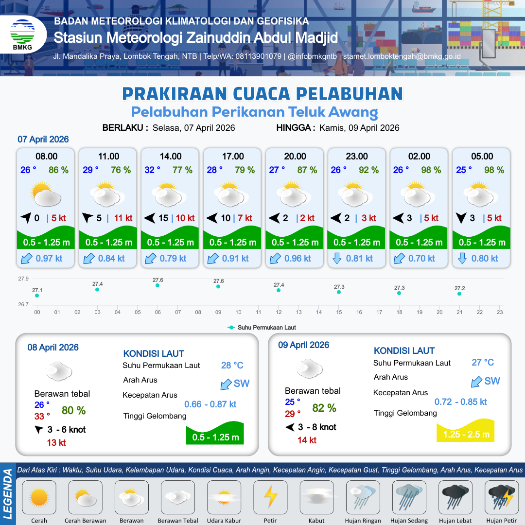 7 Apr 26, 23.00 20 jam kedepan | Barat 3 kt Gust Peningkatan kecepatan angin yang singkat dan tiba-tiba : 5 kt | 0.9 m Rendah | Selatan 0.9 Knot | 8 km | 25 °C | 98 % | +0.46 m |