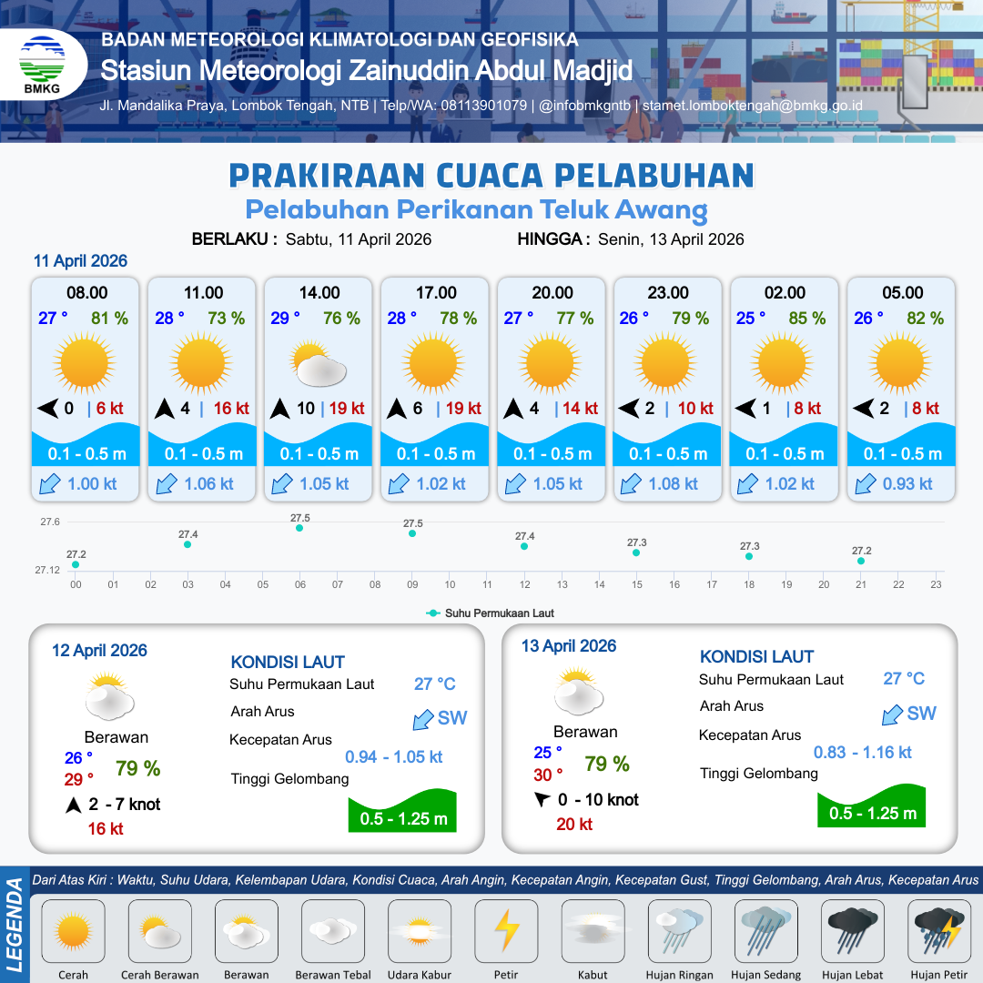 11 Apr 26, 13.00 4 jam kedepan | Selatan 4 kt Gust Peningkatan kecepatan angin yang singkat dan tiba-tiba : 13 kt | 0.5 m Rendah | Barat Daya 1.1 Knot | 9 km | 27 °C | 78 % | +0.47 m | |