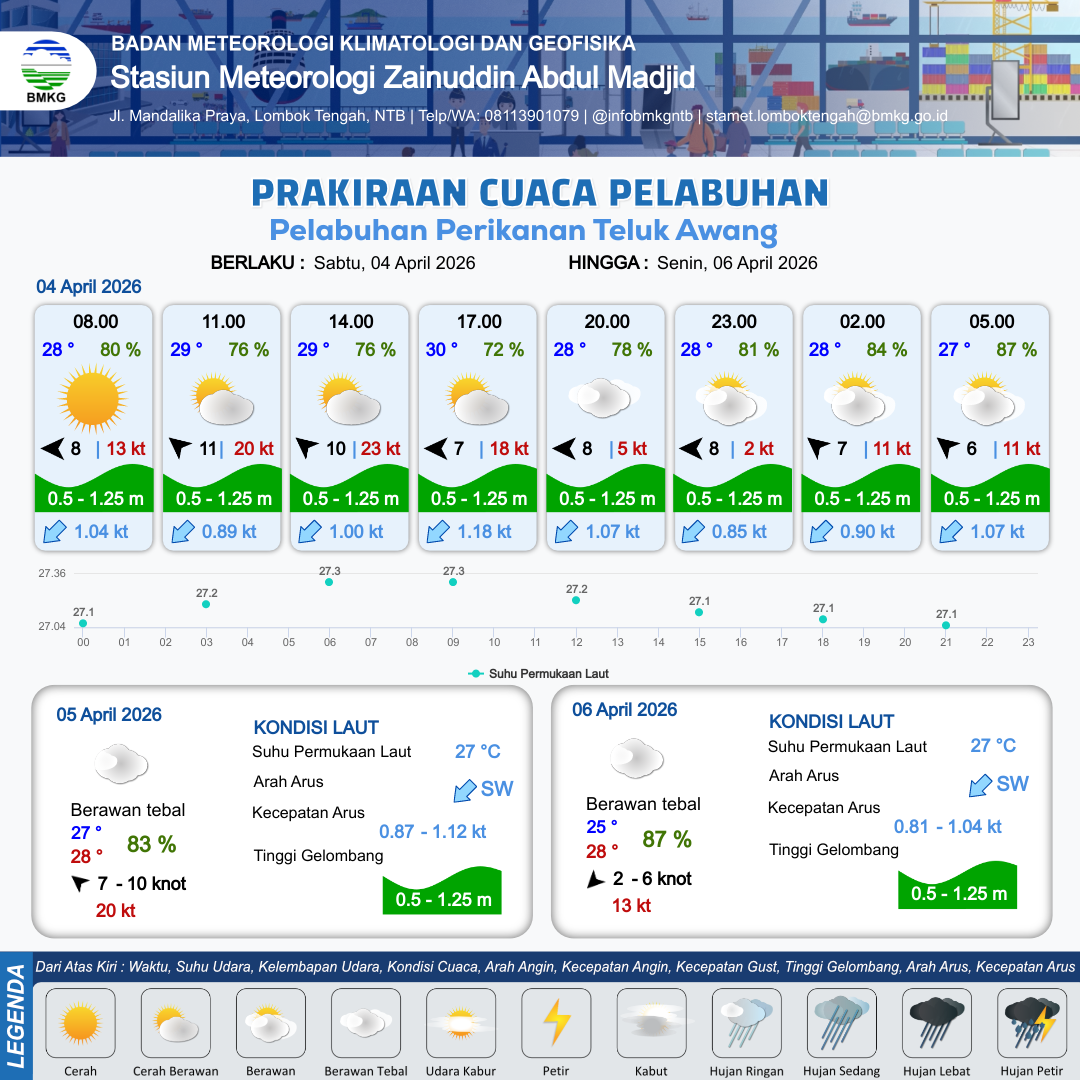 4 Apr 26, 23.00 12 jam kedepan | Tenggara 9 kt Gust Peningkatan kecepatan angin yang singkat dan tiba-tiba : 10 kt | 0.8 m Rendah | Barat Daya 1.0 Knot | 10 km | 28 °C | 85 % | +0.48 m |