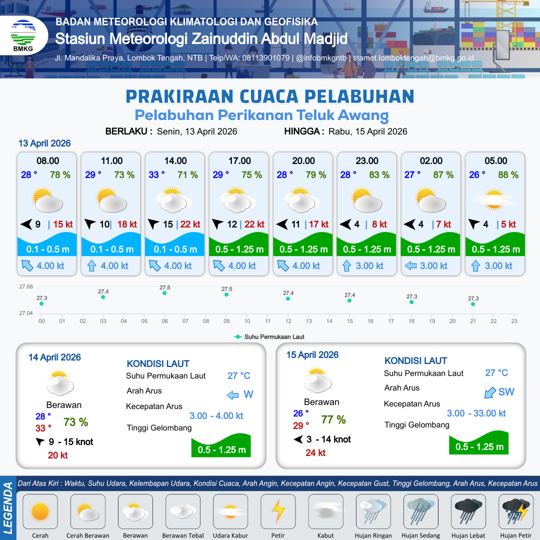 13 Apr 26, 19.00 2 jam kedepan | Timur 4 kt Gust Peningkatan kecepatan angin yang singkat dan tiba-tiba : 7 kt | 0.6 m Rendah | Utara 3.0 Knot | 8 km | 27 °C | 88 % | +0.48 m | |