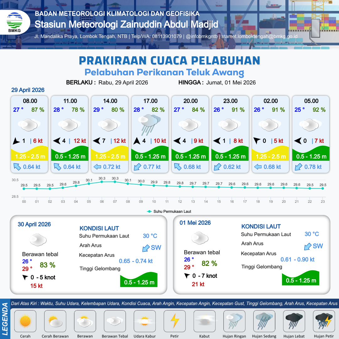 28 Apr 26, 23.00 8 jam kedepan | Barat Laut 0 kt Gust Peningkatan kecepatan angin yang singkat dan tiba-tiba : 7 kt | 1.4 m Sedang | Barat Daya 0.7 Knot | 10 km | 27 °C | 91 % | +0.49 m |