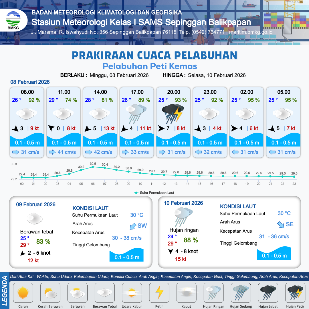 7 Feb 26, 23.00 3 jam kedepan | Berawan Tebal | Barat Laut 4 kt Gust Peningkatan kecepatan angin yang singkat dan tiba-tiba : 7 kt | | | 10 km | 25 °C | 95 % | +0.29 m |