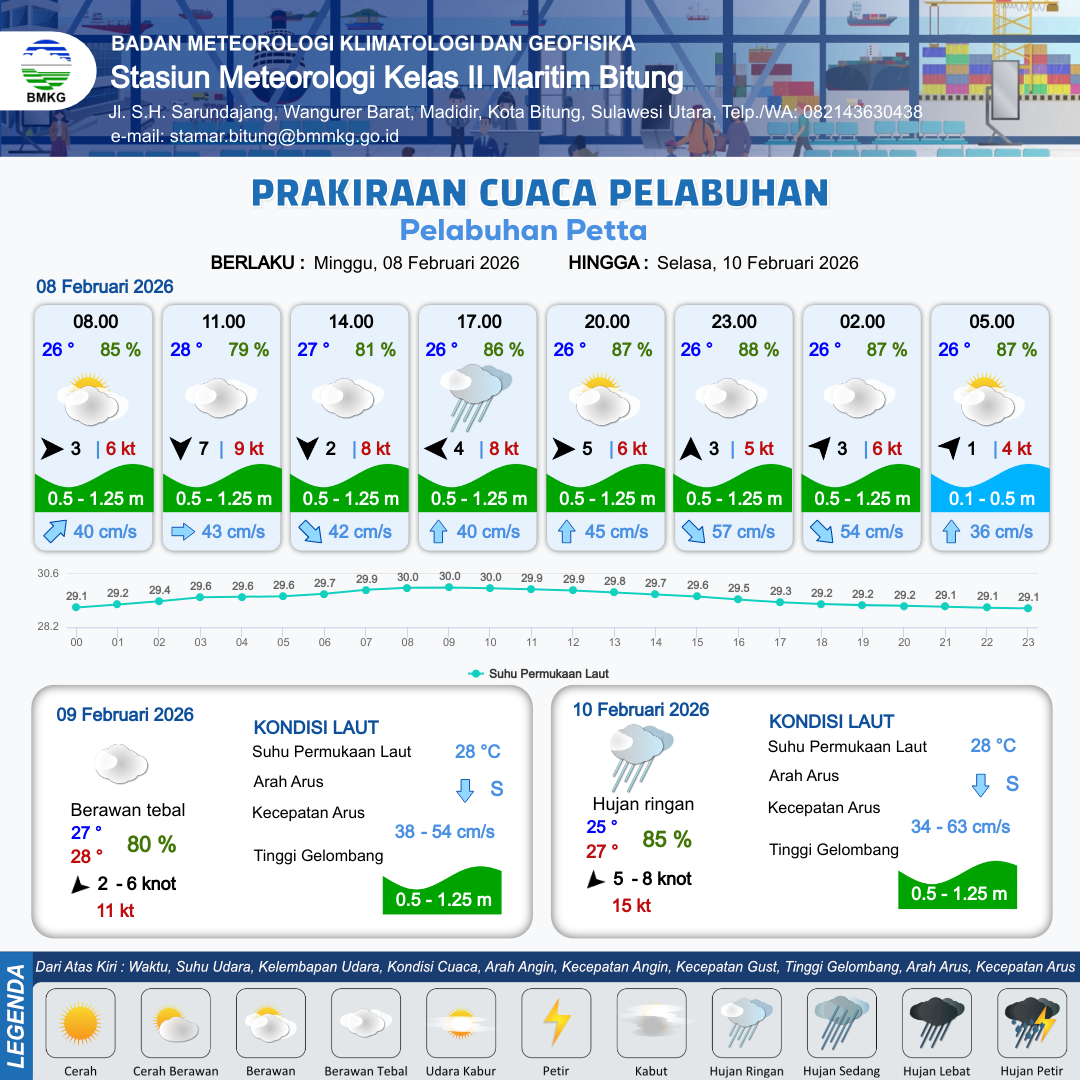 8 Feb 26, 13.00 4 jam kedepan | Barat 5 kt Gust Peningkatan kecepatan angin yang singkat dan tiba-tiba : 7 kt | 0.6 m Rendah | Timur Laut 38.0 cm/s | 10 km | 26 °C | 86 % | +0.24 m | |