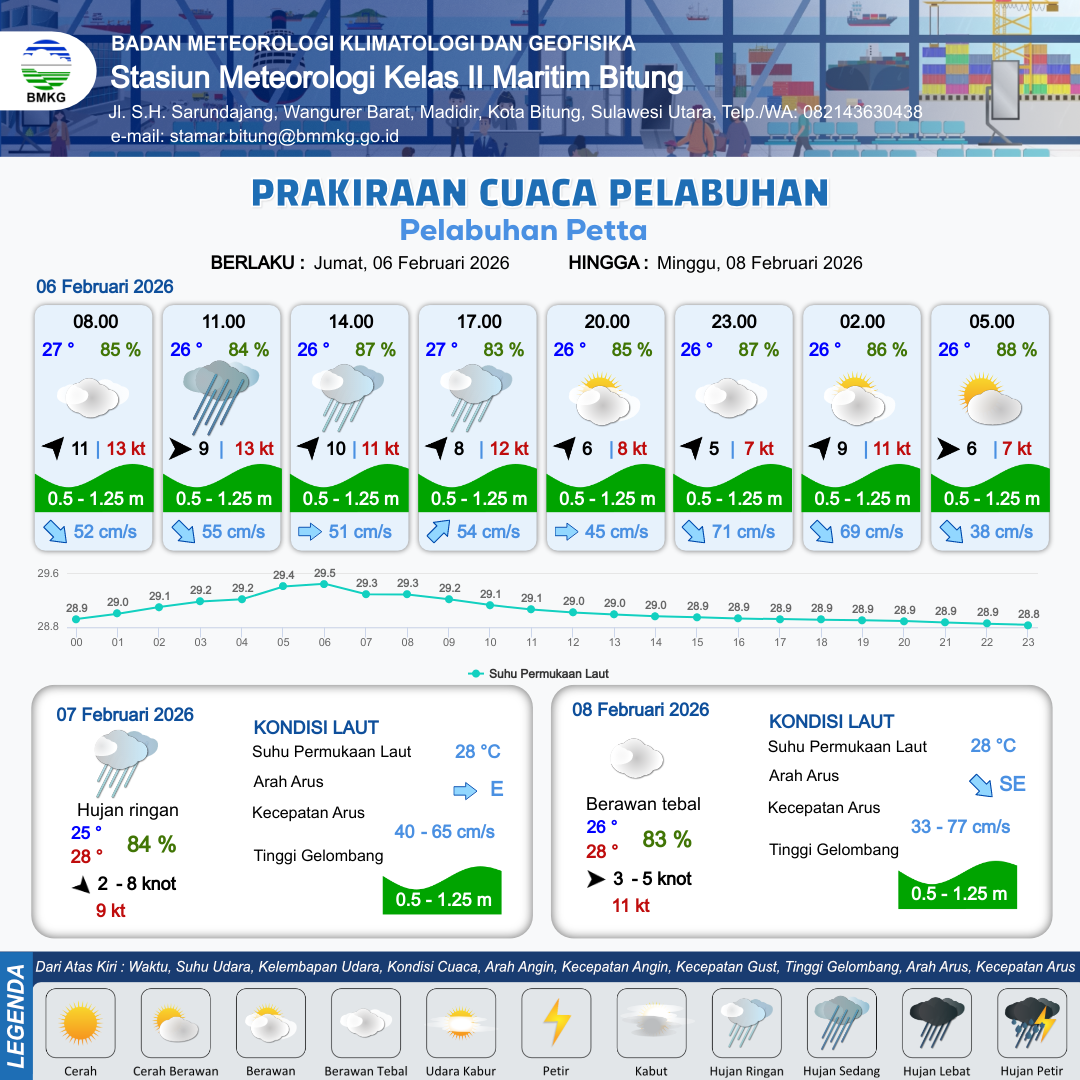 6 Feb 26, 08.00 9 jam kedepan | Barat Daya 8 kt Gust Peningkatan kecepatan angin yang singkat dan tiba-tiba : 14 kt | 1 m Rendah | Timur Laut 53.0 cm/s | 5 km | 27 °C | 80 % | -0.35 m | |