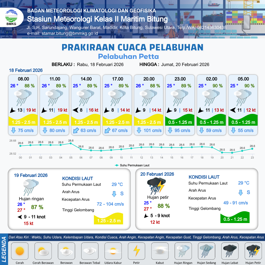 18 Feb 26, 17.00 2 jam kedepan | Timur Laut 11 kt Gust Peningkatan kecepatan angin yang singkat dan tiba-tiba : 12 kt | 1.2 m Rendah | Selatan 70.0 cm/s | 5 km | 25 °C | 89 % | -0.88 m | |