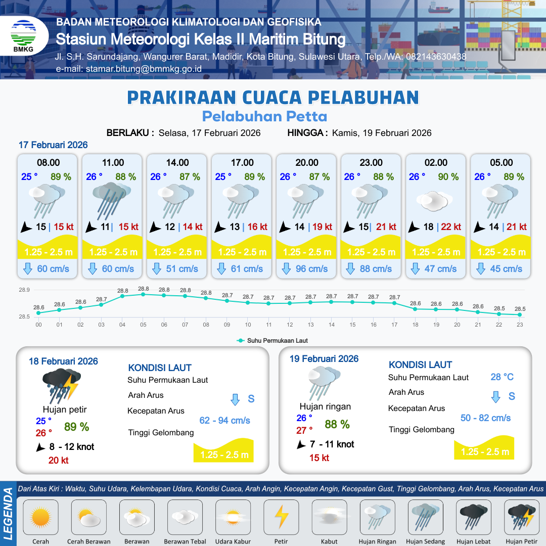 17 Feb 26, 17.00 2 jam kedepan | Timur Laut 18 kt Gust Peningkatan kecepatan angin yang singkat dan tiba-tiba : 22 kt | 1.6 m Sedang | Selatan 59.0 cm/s | 10 km | 26 °C | 88 % | -0.86 m | |