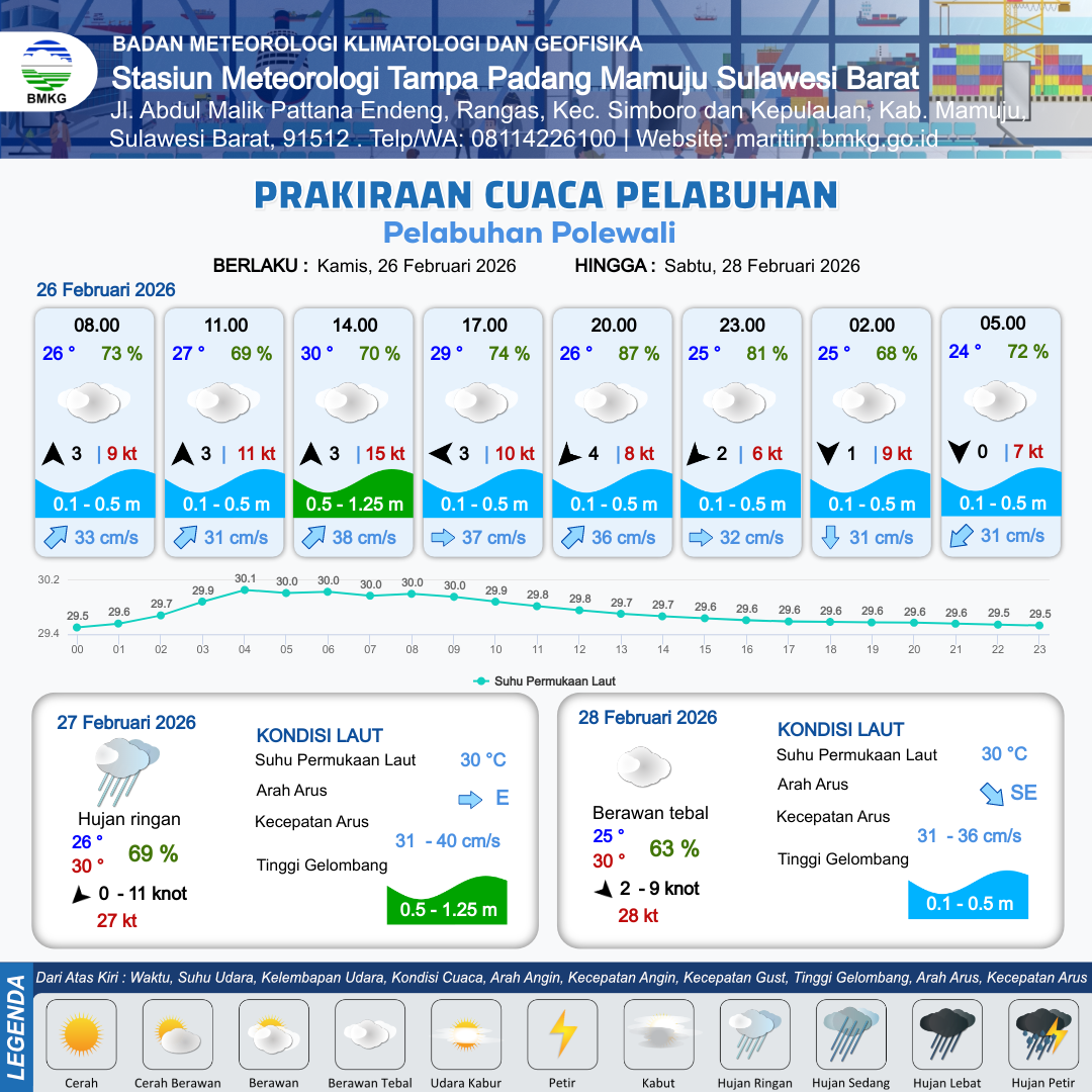 26 Feb 26, 08.00 12 jam yang lalu | Berawan Tebal | Timur 3 kt Gust Peningkatan kecepatan angin yang singkat dan tiba-tiba : 11 kt | | | 9 km | 30 °C | 71 % | +0.17 m |