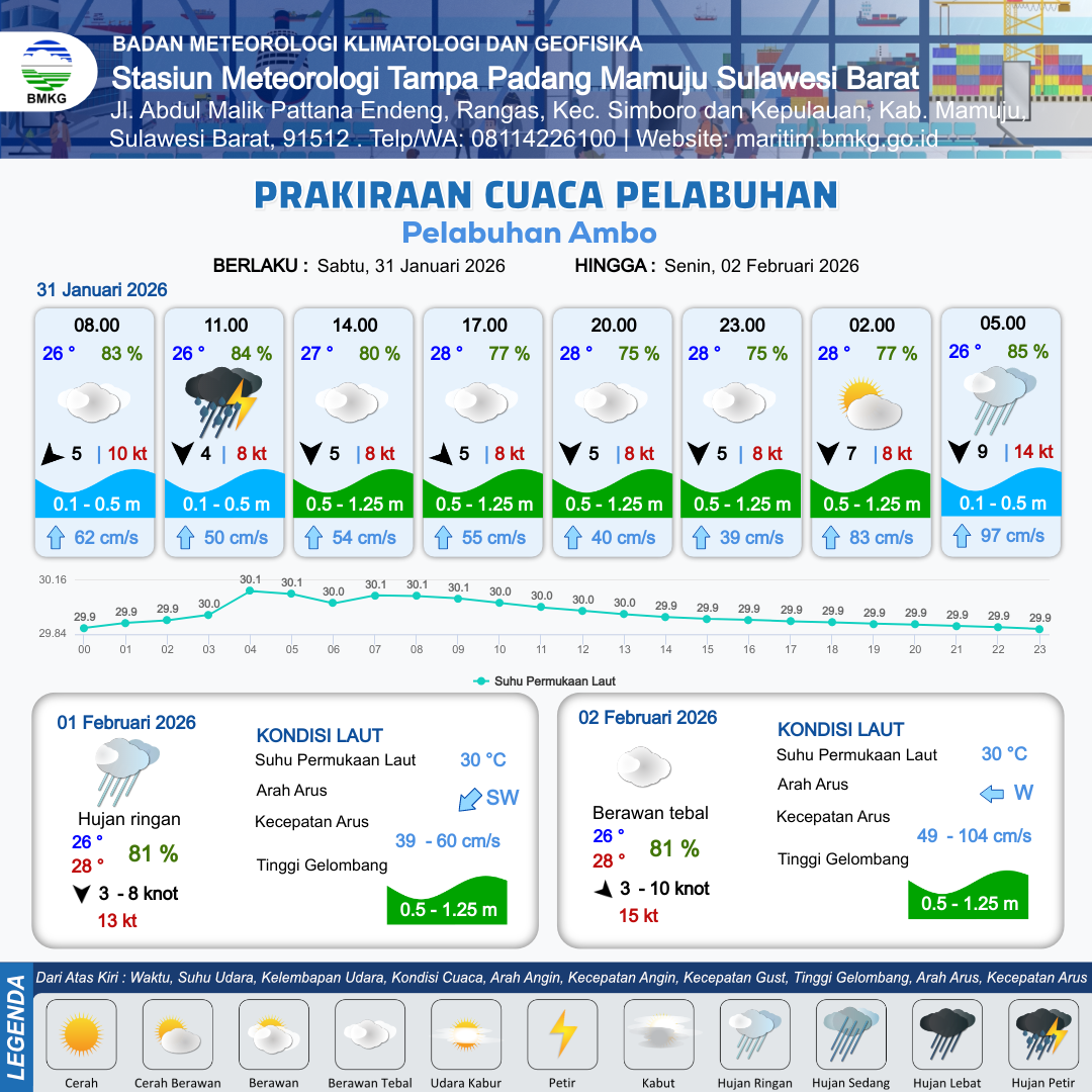 31 Jan 26, 08.00 4 jam kedepan | Utara 4 kt Gust Peningkatan kecepatan angin yang singkat dan tiba-tiba : 8 kt | 0.9 m Rendah | Selatan 36.0 cm/s | 10 km | 27 °C | 79 % | +0.73 m | |
