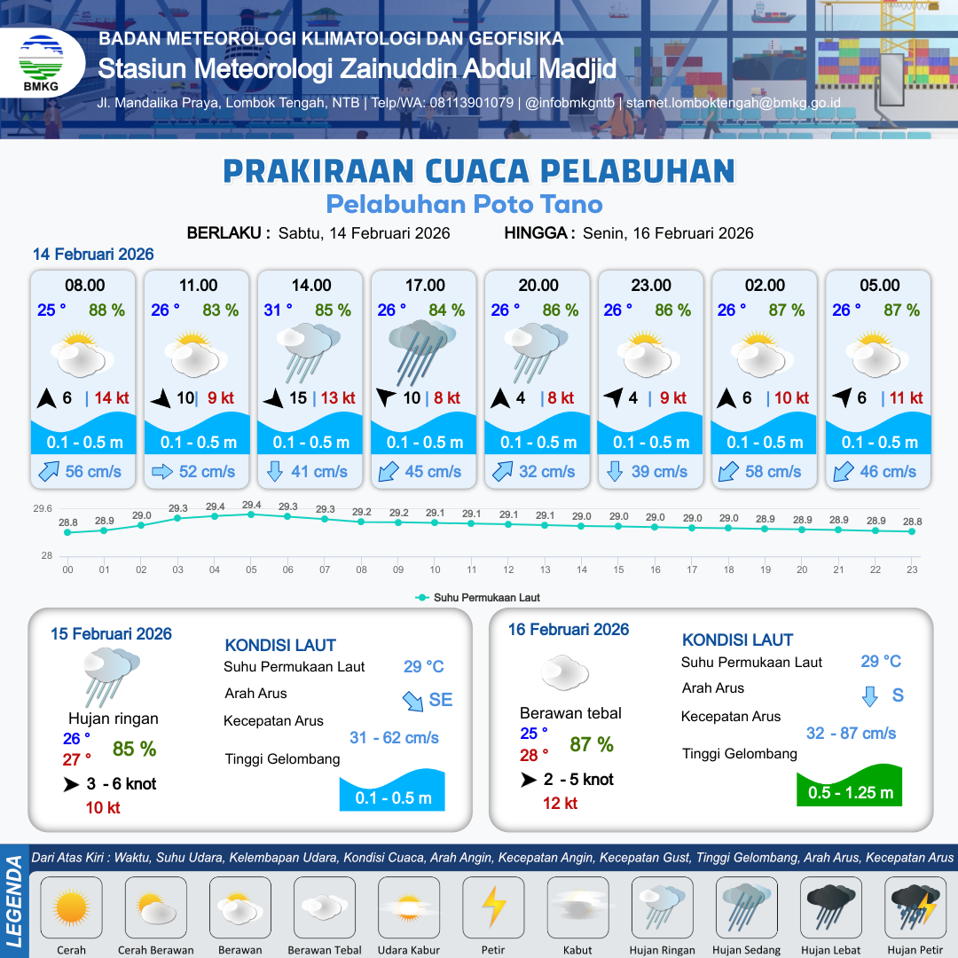 14 Feb 26, 06.00 4 jam kedepan | Barat Laut 15 kt Gust Peningkatan kecepatan angin yang singkat dan tiba-tiba : 13 kt | 0.3 m Tenang | Selatan 41.0 cm/s | 5 km | 31 °C | 85 % | +0.06 m | |
