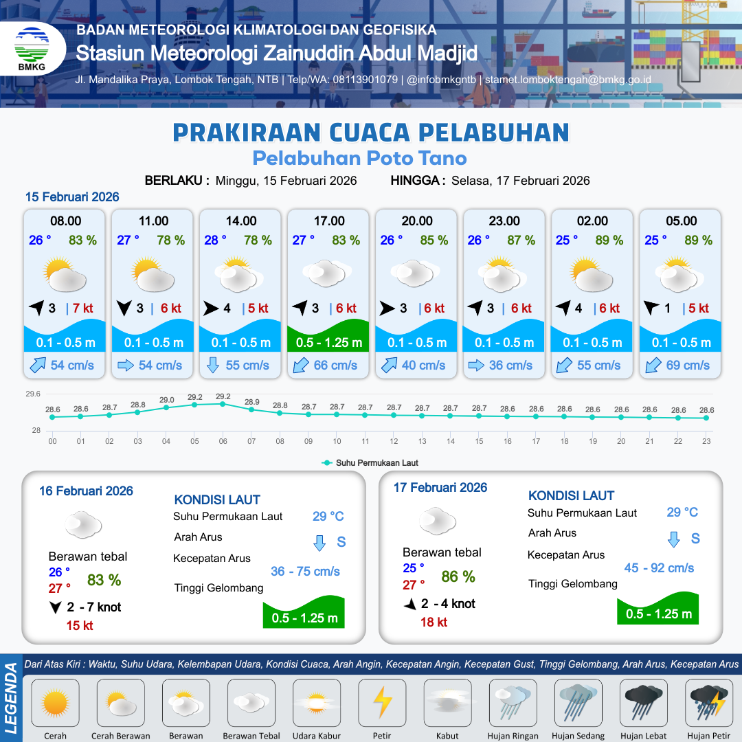 15 Feb 26, 23.00 9 jam kedepan | Utara 5 kt Gust Peningkatan kecepatan angin yang singkat dan tiba-tiba : 4 kt | 0.2 m Tenang | Barat 47.0 cm/s | 10 km | 26 °C | 87 % | -0.73 m |