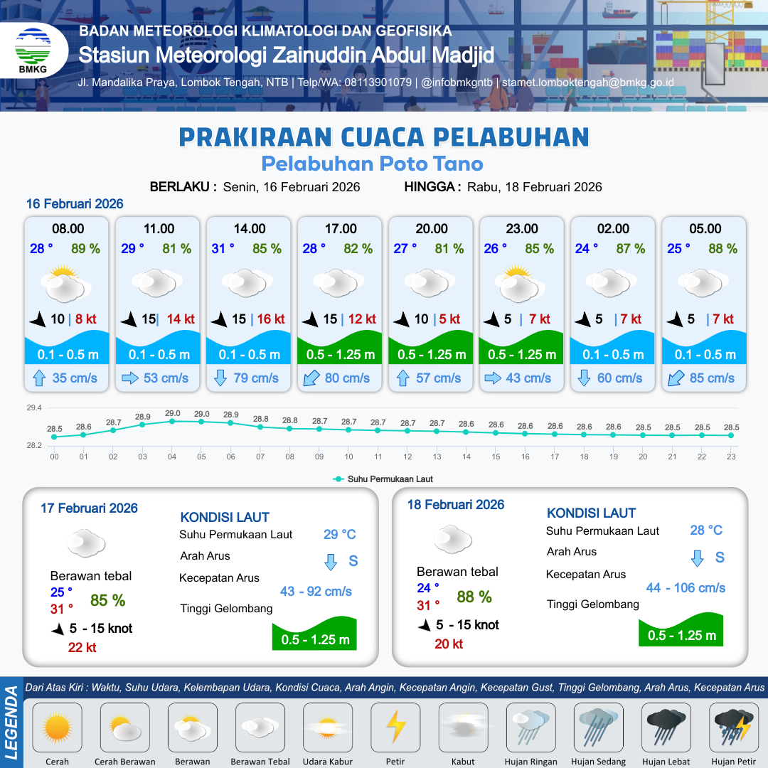 16 Feb 26, 17.00 2 jam kedepan | Barat Laut 5 kt Gust Peningkatan kecepatan angin yang singkat dan tiba-tiba : 9 kt | 0.4 m Tenang | Selatan 50.0 cm/s | 7 km | 25 °C | 86 % | +0.31 m | |
