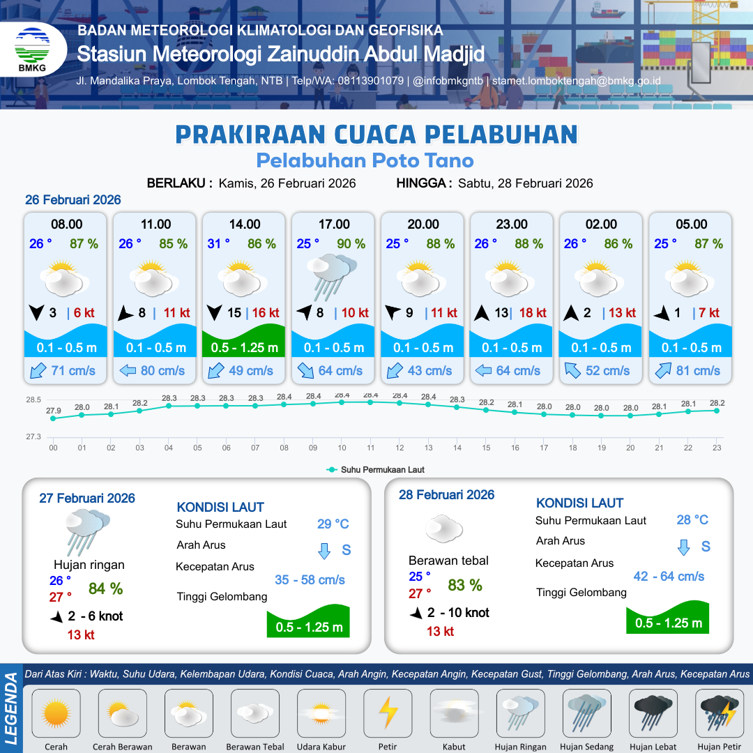 27 Feb 26, 08.00 9 jam kedepan | Barat 7 kt Gust Peningkatan kecepatan angin yang singkat dan tiba-tiba : 6 kt | 0.3 m Tenang | Timur 32.0 cm/s | 10 km | 26 °C | 84 % | +0.01 m | |