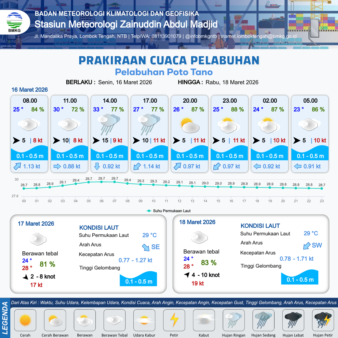 16 Mar 26, 14.00 12 jam kedepan | Barat 5 kt Gust Peningkatan kecepatan angin yang singkat dan tiba-tiba : 11 kt | 0.3 m Tenang | Barat Daya 1.0 Knot | 7 km | 25 °C | 88 % | +0.47 m | |