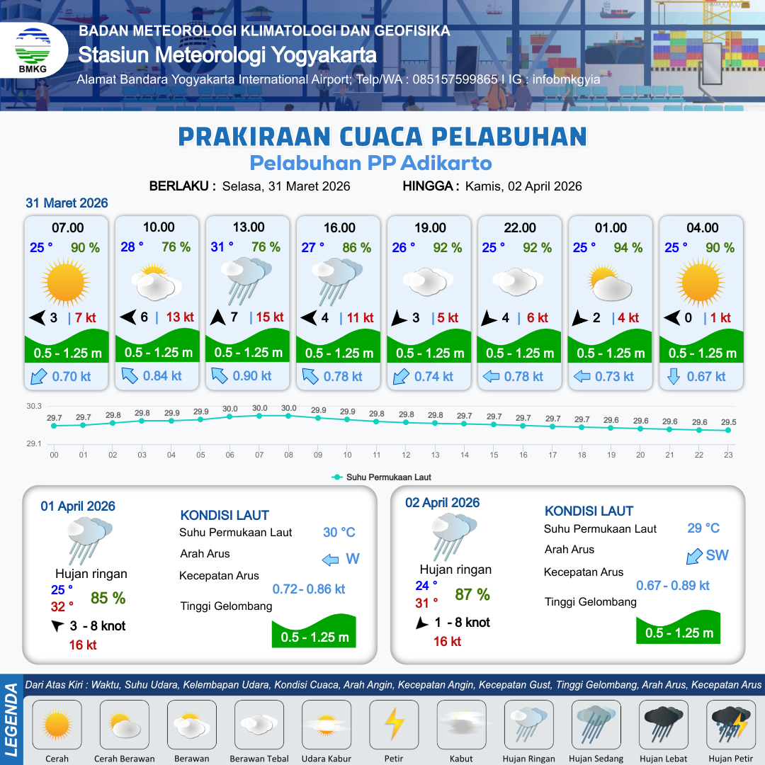 30 Mar 26, 23.00 11 jam kedepan | Timur 3 kt Gust Peningkatan kecepatan angin yang singkat dan tiba-tiba : 4 kt | 0.8 m Rendah | Barat Daya 0.6 Knot | 10 km | 24 °C | 91 % | +0.19 m |