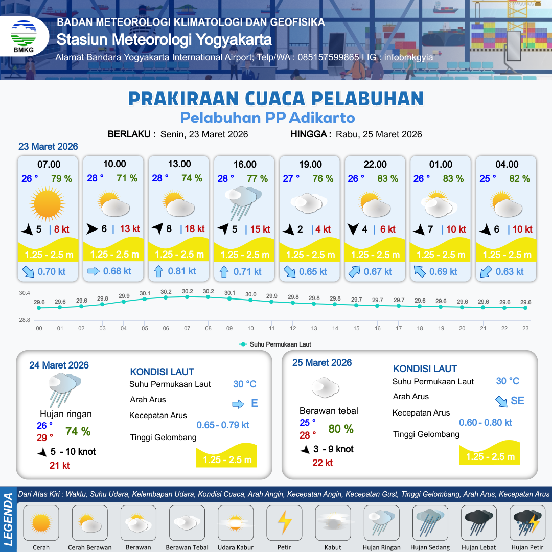 23 Mar 26, 07.00 7 jam kedepan | Barat Daya 8 kt Gust Peningkatan kecepatan angin yang singkat dan tiba-tiba : 18 kt | 1.7 m Sedang | Utara 0.8 Knot | 10 km | 28 °C | 75 % | -0.06 m | |