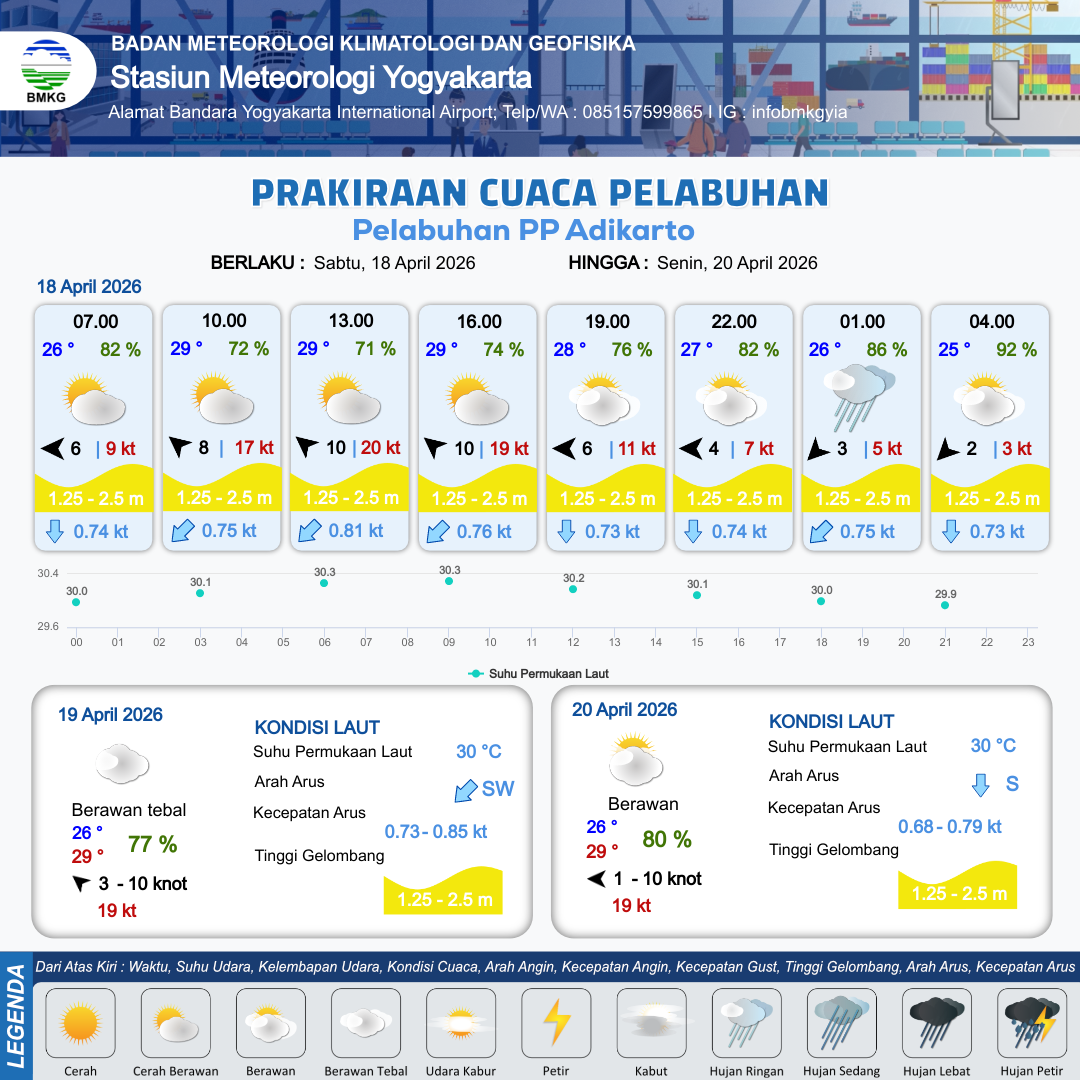 18 Apr 26, 13.00 2 jam kedepan | Timur 6 kt Gust Peningkatan kecepatan angin yang singkat dan tiba-tiba : 8 kt | 1.5 m Sedang | Selatan 0.7 Knot | 10 km | 27 °C | 80 % | +0.50 m | |