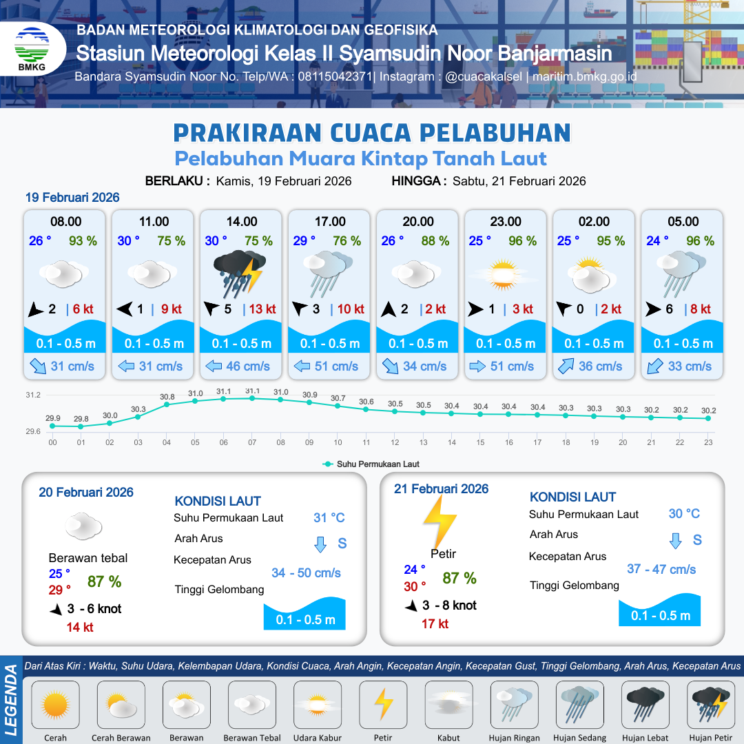 19 Feb 26, 18.00 3 jam kedepan | Barat 3 kt Gust Peningkatan kecepatan angin yang singkat dan tiba-tiba : 8 kt | 0.2 m Tenang | Utara 35.0 cm/s | 3 km | 25 °C | 96 % | -0.23 m | |