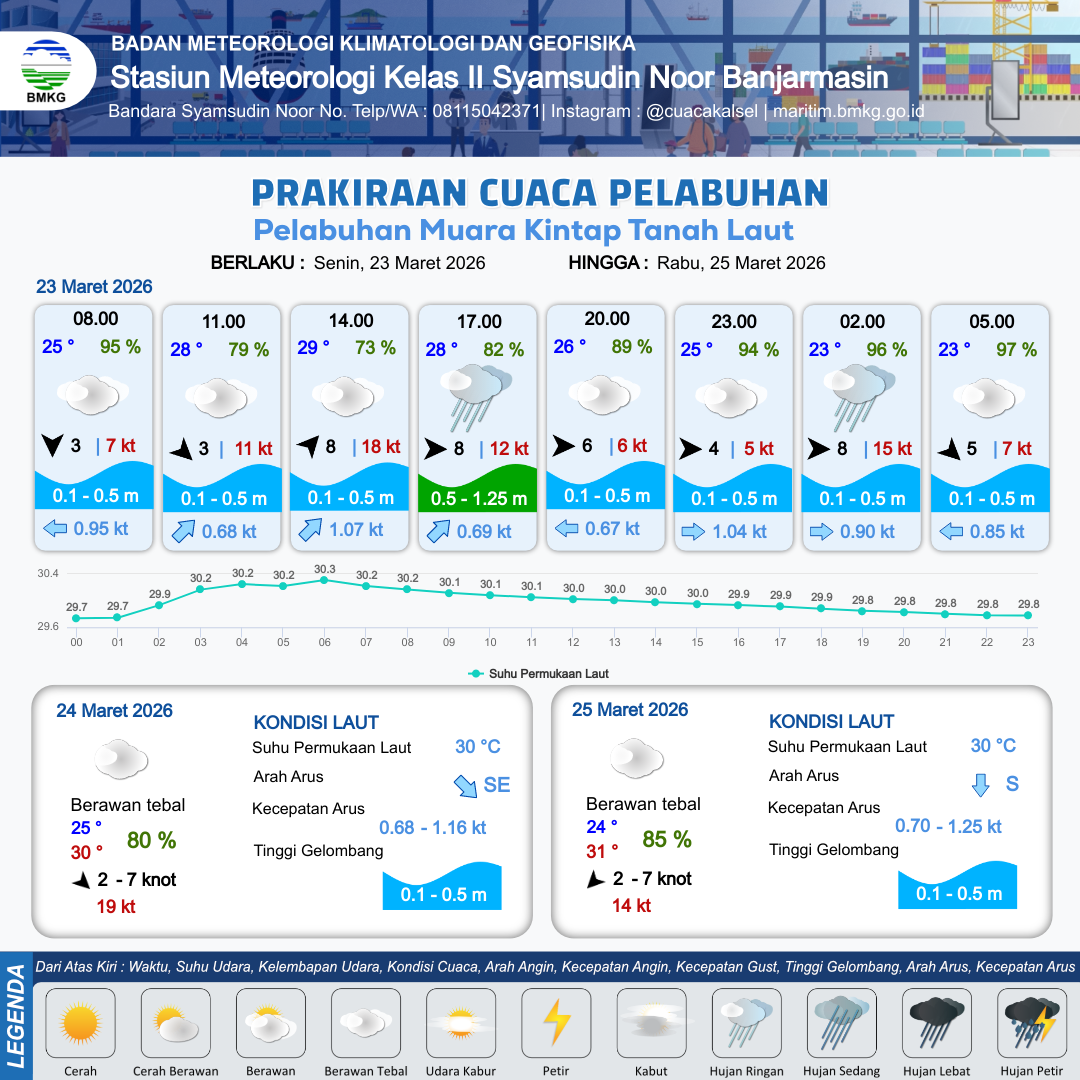 23 Mar 26, 17.00 15 jam kedepan | Barat Daya 6 kt Gust Peningkatan kecepatan angin yang singkat dan tiba-tiba : 5 kt | 0.3 m Tenang | Tenggara 0.8 Knot | 6 km | 25 °C | 92 % | -0.69 m | |